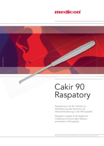Raspatorium mit 90°-Winkel zur Mobilisierung des Knochen bei Höckerreduzierung in der Rhinoplastik Raspatory angled at 90 degree for mobilizing the bone after letdown procedure in Rhinoplasty Cakir 90 Raspatory b Cakir 90 Raspatorium / Cakir 90 Raspatory Application: The Cakir 90 raspatory supports the controlled lateral osteotomy during rhinoplasty procedures. It is used for mobilizing the bone after letdown procedure. The raspatory - sharpened on both sides of the blade – also helps to remove bone material without causing bone cracks and fissures (bad fractures). The removed bone material (bone dust) is well suitable to fill up imperfections at the nasal bridge. Anwendung: Das Cakir 90 Raspatorium unterstützt die einfache und kontrollierte laterale Osteotomie in der Rhinoplastik. Es dient zur Mobilisierung des Knochen bei Höckerreduzierung. Mit der beidseitig scharfen Klinge kann Knochenmaterial abgetragen werden, ohne ungewollte Risse (bad fractures) im Knochen zu verursachen. Das abgetragene Knochenmaterial (bone dust) eignet sich zum Auffüllen von Unregelmäßigkeiten am Nasenrücken. Ergänzendes Produkt / Additional product: 67.15.30 a = 5,5 mm b = 19 cm Knorpelschneidblock Propylux / Dicing Block Propylux Zum feinen Würfeln von Knorpel For fine dicing of cartilage 67.19.81 120 × 120 × 15 mm PROPYLUX Copyright © 2017 by Dr. Bariş Cakir, Istanbul Not all products illustrated in this documentation are available for sale in all countries. Not for all declared products in this documentation Medicon is the legal manufacturer. Please contact your local distributor for more information concerning availability and regulatory information (e.g. classification) of the mentioned products. Patterns are subject to change. 453.33.00 © Copyright 03/2025, MEDICON eG, Tuttlingen, Deutschland Medicon eG Gänsäcker 15 · D-78532 Tuttlingen · Germany · Tel.: +49 (0) 74 62 / 20 09-0 Fax: +49 (0) 74 62 / 20 09-50 · E-Mail: sales@medicon.de · Internet: www.medicon.de a Kunststoff (autoklavierbar bei 134 °C) Plastic (autoclavable at 134 °C)